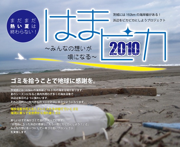 茨城県には192kmの海岸線と18か所の海水浴場があります。毎年夏になると、県内をはじめ県外からもたくさんの海水浴客や有名人が茨城の海岸を訪れ、夏の思い出をつくって帰っていきます。そんな海も夏も終わりに近づくと海水浴客が残していったゴミ、世界各国から流れ着くゴミであふれかえります。「お世話になった海に感謝し、もう一度ピカピカにしよう!」と、みんなの想いを一つにして一斉ゴミ拾いプロジェクトが始動しました!